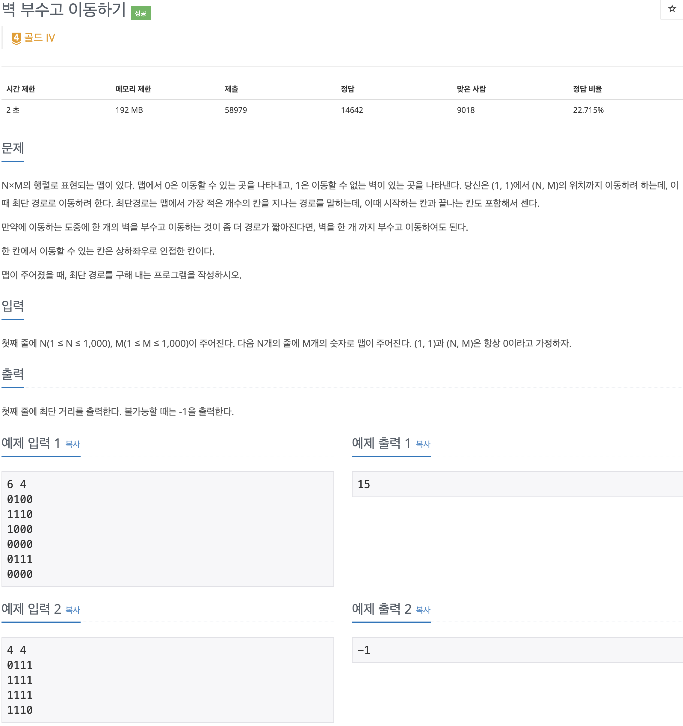 N×M의 행렬로 표현되는 맵이 있다. 맵에서 0은 이동할 수 있는 곳을 나타내고, 1은 이동할 수 없는 벽이 있는 곳을 나타낸다. 당신은 (1, 1)에서 (N, M)의 위치까지 이동하려 하는데, 이때 최단 경로