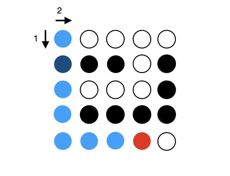 그럼 2번 방향으로 진행을 한다면? 가는 길에 벽이 없기 때문에 빨간 지점까지는 도달할 수 있지만, 이미 1번 케이스에서 지나간 길을 방문 표시했기 때문에 도달하지 못하게 된다.