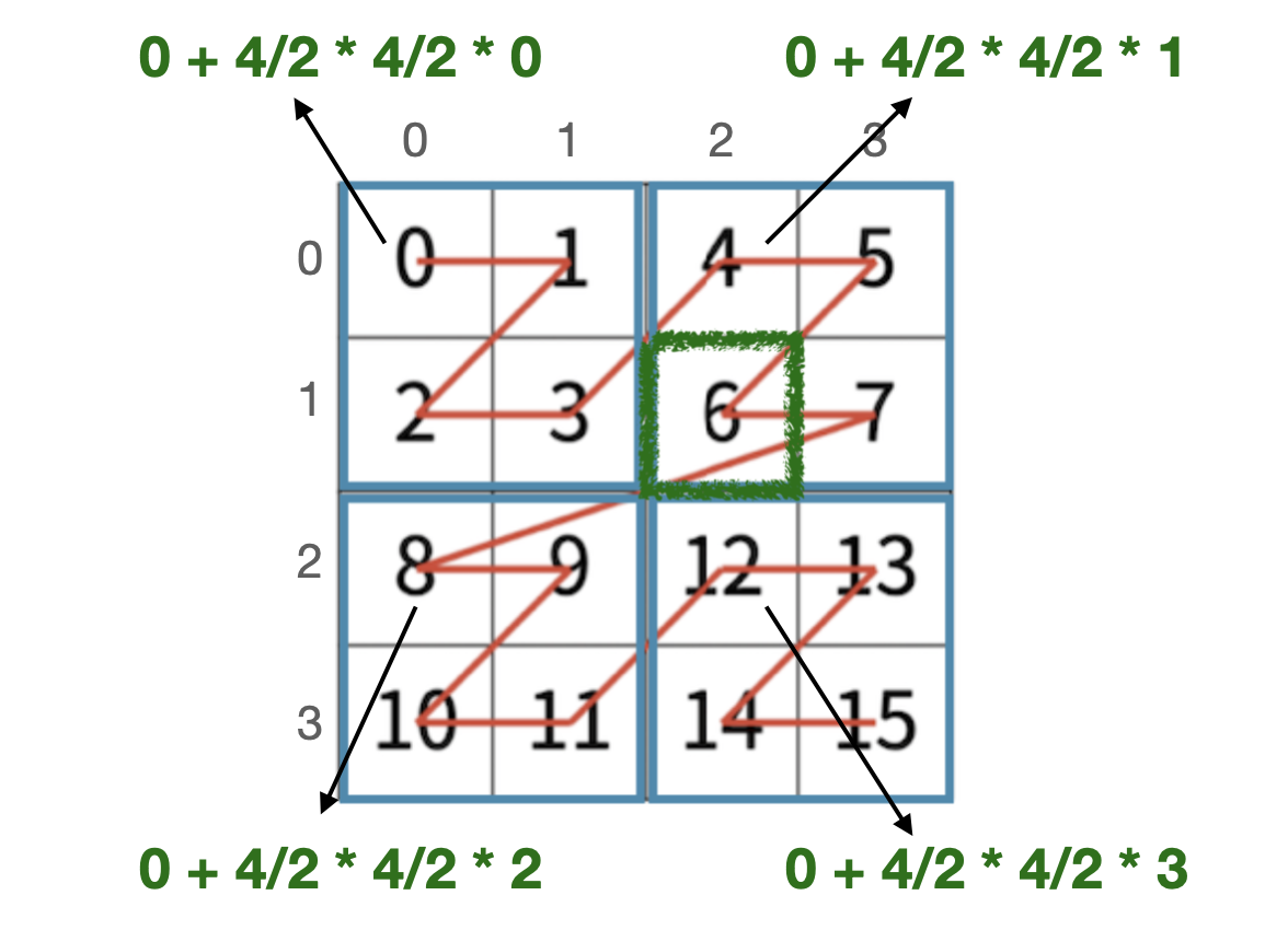 위 코드에서 count = count + ( len / 2 * len / 2 * i); 라는 코드를 보면, 각 사분면의 방문횟수는 아래의 그림처럼 나타낼 수 있다.