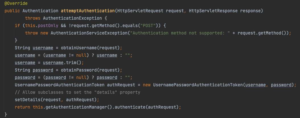 public Authentication attemptAuthentication(HttpServletRequest request, HttpServletResponse response) throws AuthenticationException {