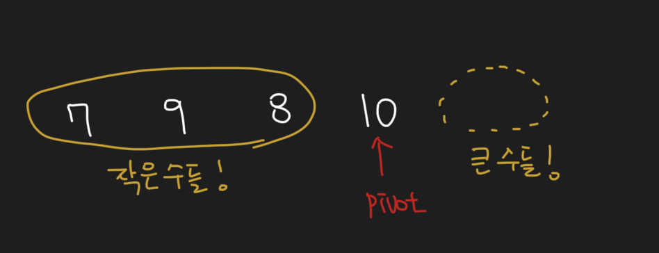 피봇을 기준으로 왼쪽에는 피봇보다 작은 수, 오른쪽은 큰 수가 오게 됩니다. (현재는 큰 수가 없음.)