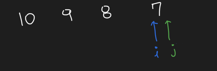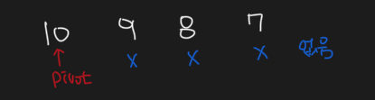 - 먼저 마지막 위치부터 인덱스를 감소시키면서 피봇보다 작은 수를 찾는다. (왜 먼저 작은 수 부터 찾는지 아래에서 설명하겠습니다.)