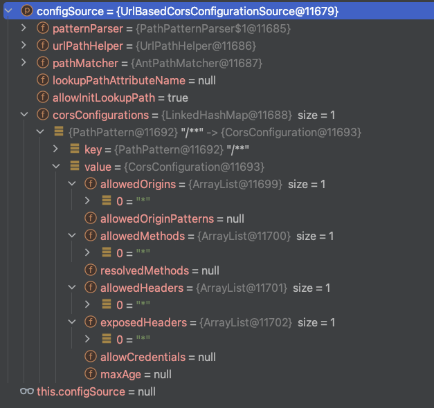우리가 시큐리티에서 설정해줬던 ConfigurationSource가 정상적으로 등록된 것을 확인할 수 있습니다.