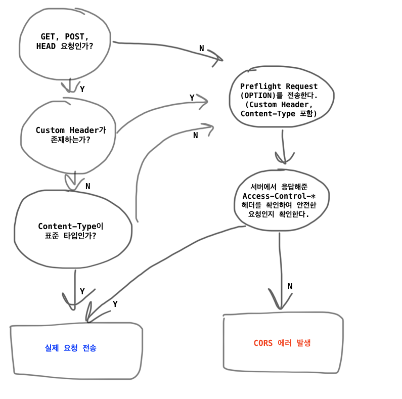 Simple Request 외 요청들은 모두 OPTION 를 통해 다른 도메인의 리소스로 HTTP 요청을 보내 실제 요청이 안전한지 확인합니다. 이를 Preflight라고 하는 것입니다.