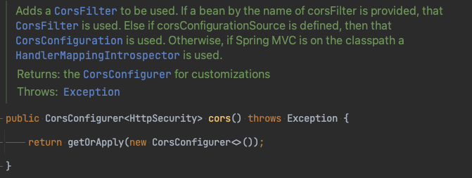 corsConfigurationSource가 빈으로 등록되어 있으면 해당 설정을 적용합니다. - 그렇지 않고, Spring MVC가 클래스 패스에 있는 경우 HandlerMappingIntrospector가 사용됩니다.