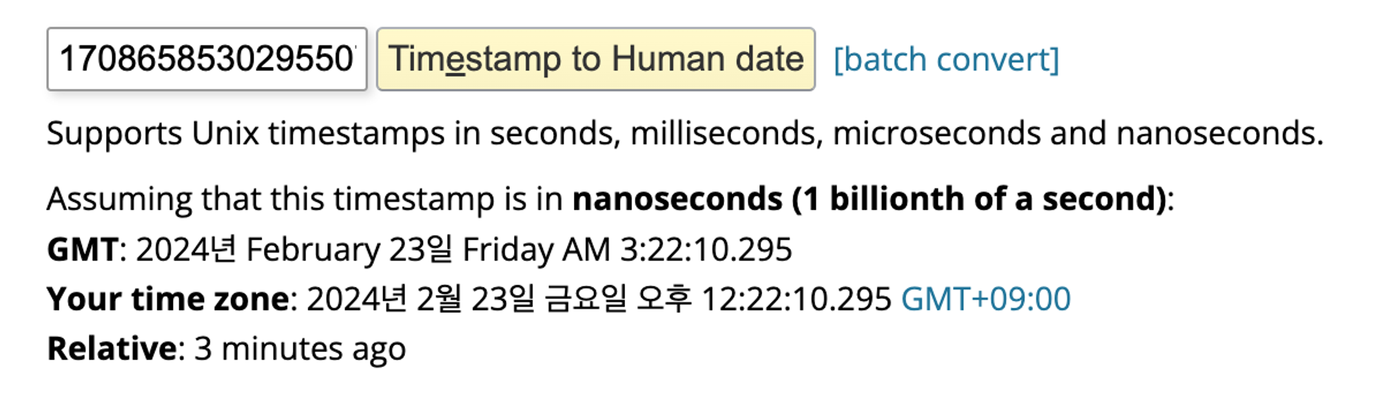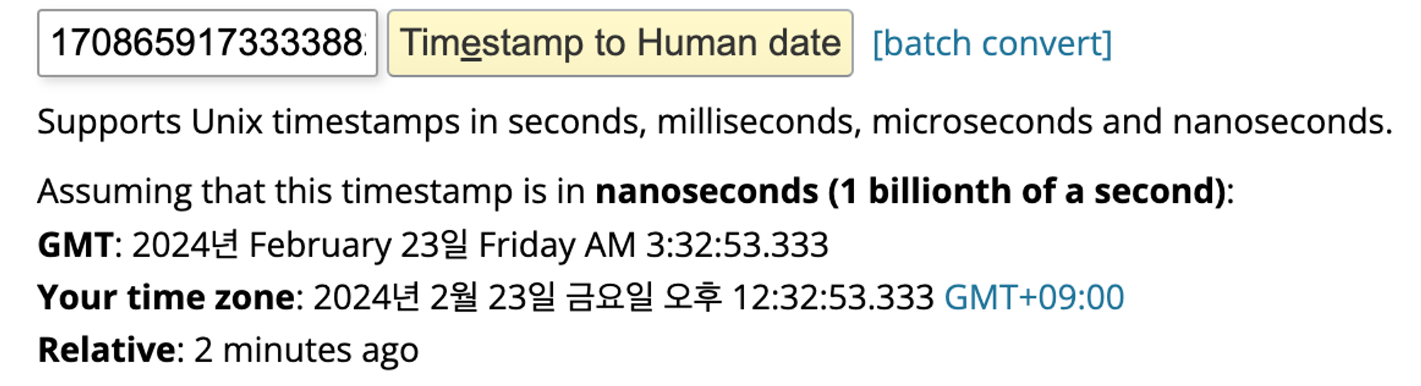 UTC-NS: 1708659173333882112 # -0시간 됨, **2024-02-23T03:32:53.333Z**