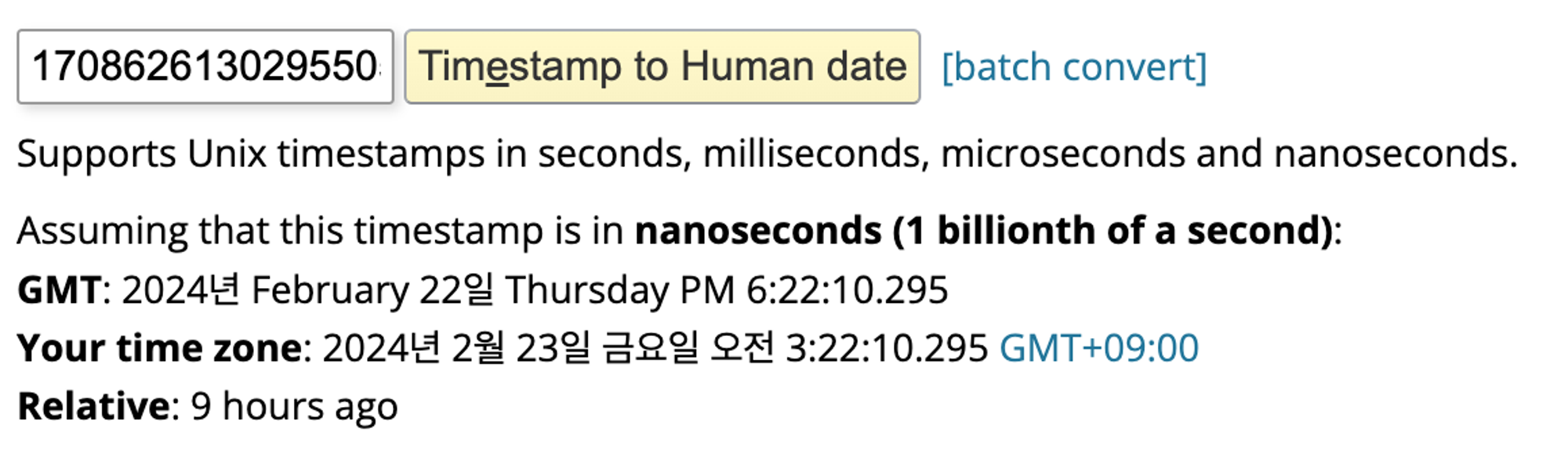 UTC-NS: 1708626130295505152 # -9시간 됨, **2024-02-22T18:22:10.295Z**