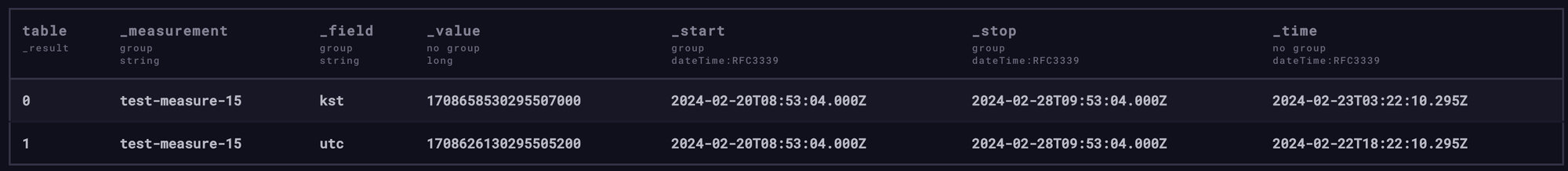💡 서버 시간에 따라서 `datetime.timestamp()` 함수가 UTC 시간으로 보정하여 변환한다. 그렇기 때문에 서버 타임존에 따라서 timestamp()의 결과가 달라질 뿐, influxdb_client 라이브러리를 통해 데이터 삽입 시에는 따로 시간이 변환되지 않는다. 입력 시간을 무조건 UTC로 간주한다.