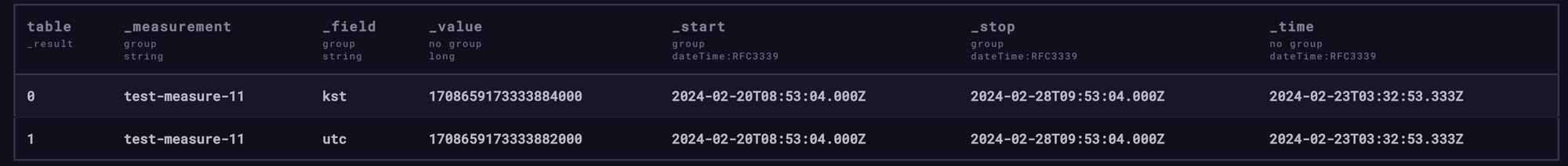 시간 뒤에 타임존에 대한 정보가 있으니, influxdb-client 라이브러리가 UTC로 변환하여 저장시키는 것을 확인할 수 있습니다. 이 테스트로 저희는 다음과 같은 결론을 내릴 수 있습니다.