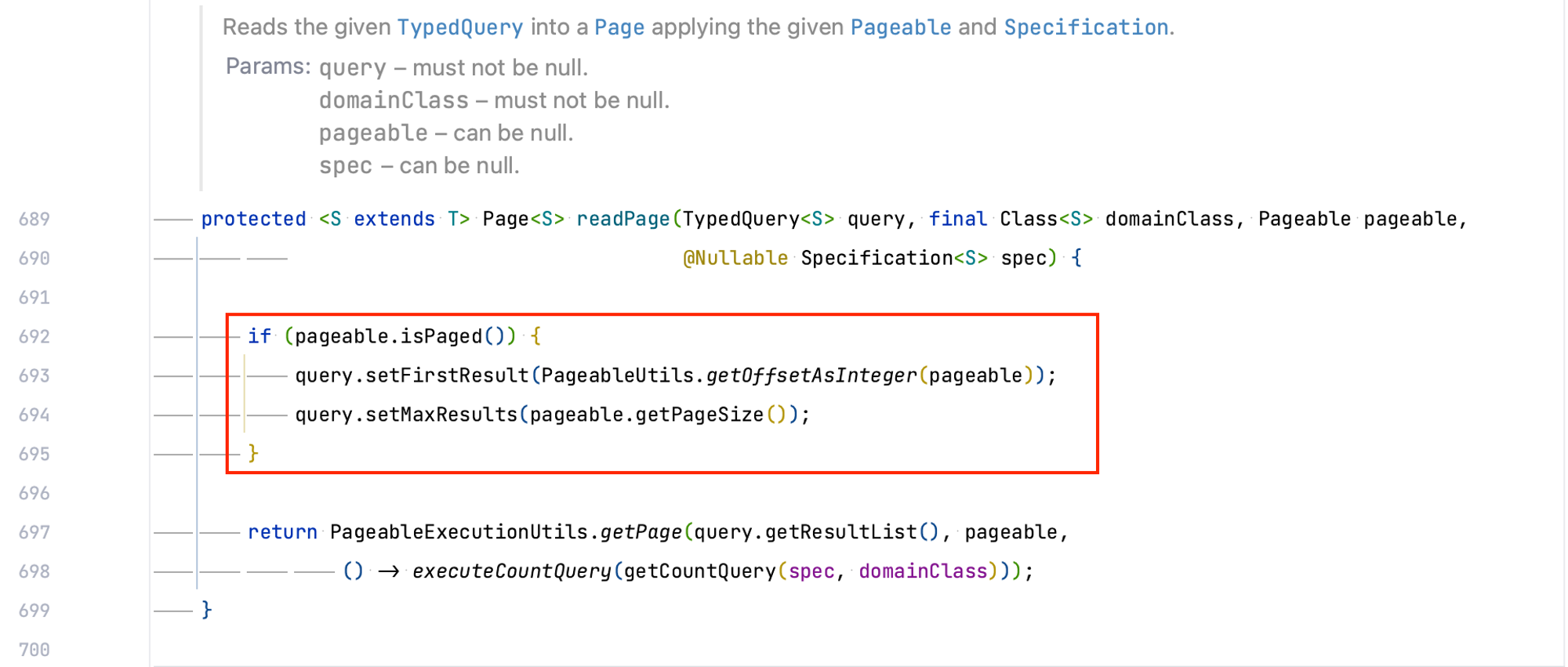 SimpleJpaRepository에서 페이지 요청이 있으면 offSet과 MaxResults를 지정해주고 있습니다. 그 정보를 바탕으로 실제 쿼리를 날릴 때 Offset과 First or Top을 이용해서 Limit를 구현합니다. (자세한 글은 다음을 참조)