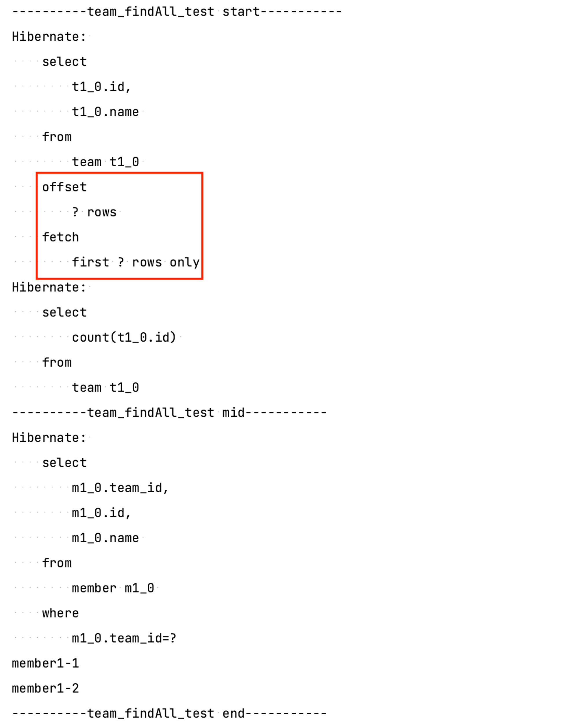 로그를 살펴보면, Paging이 잘 처리되었습니다. 그리고 Team에 속한 member, sponsor를 사용할 때 쿼리가 발생하였고, where in 절을 통해 Eager Loading을 하는 것을 볼 수 있습니다.