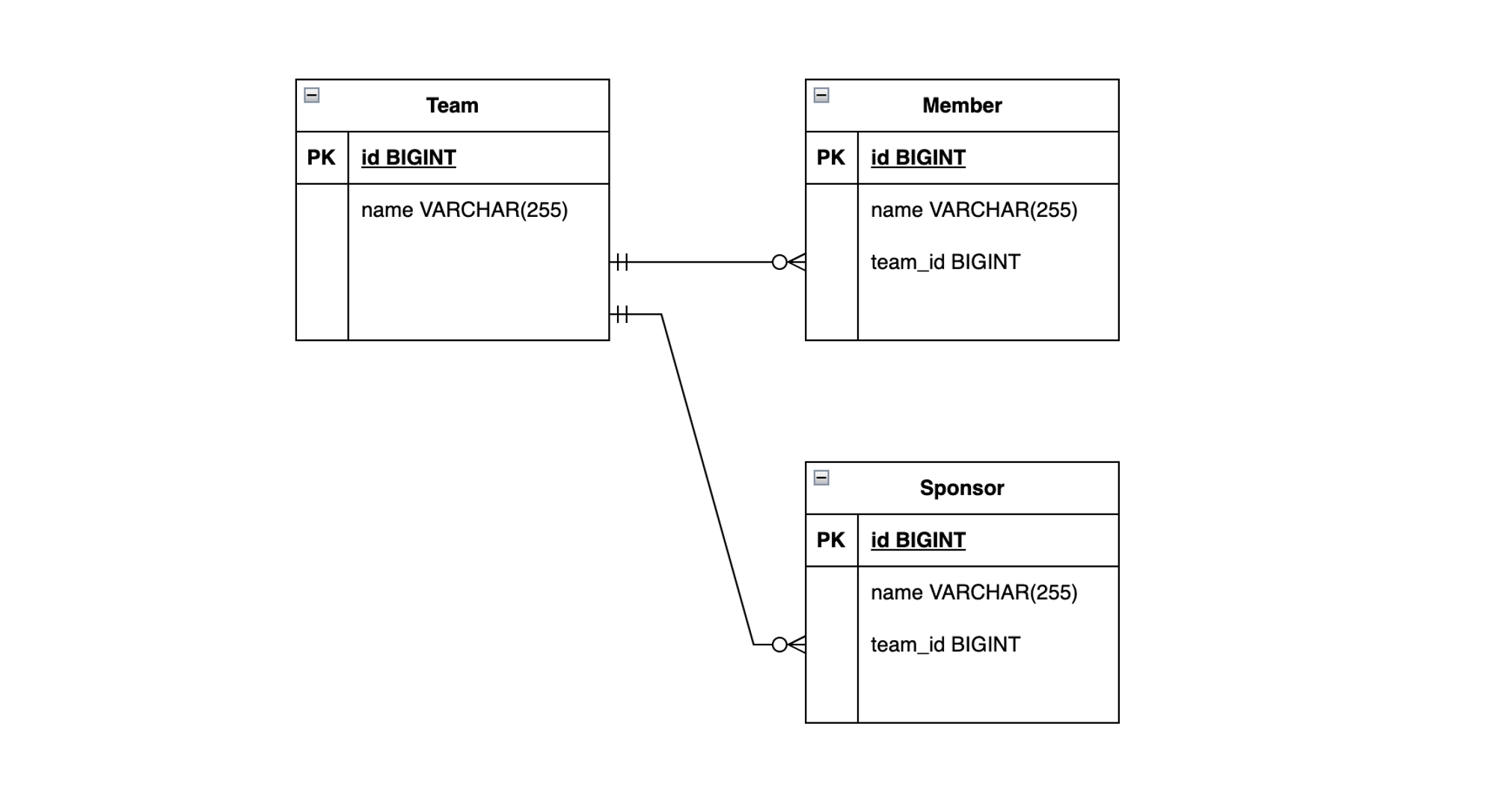 위 ERD 처럼 Team이 members, sponsors를 갖는 구조입니다.