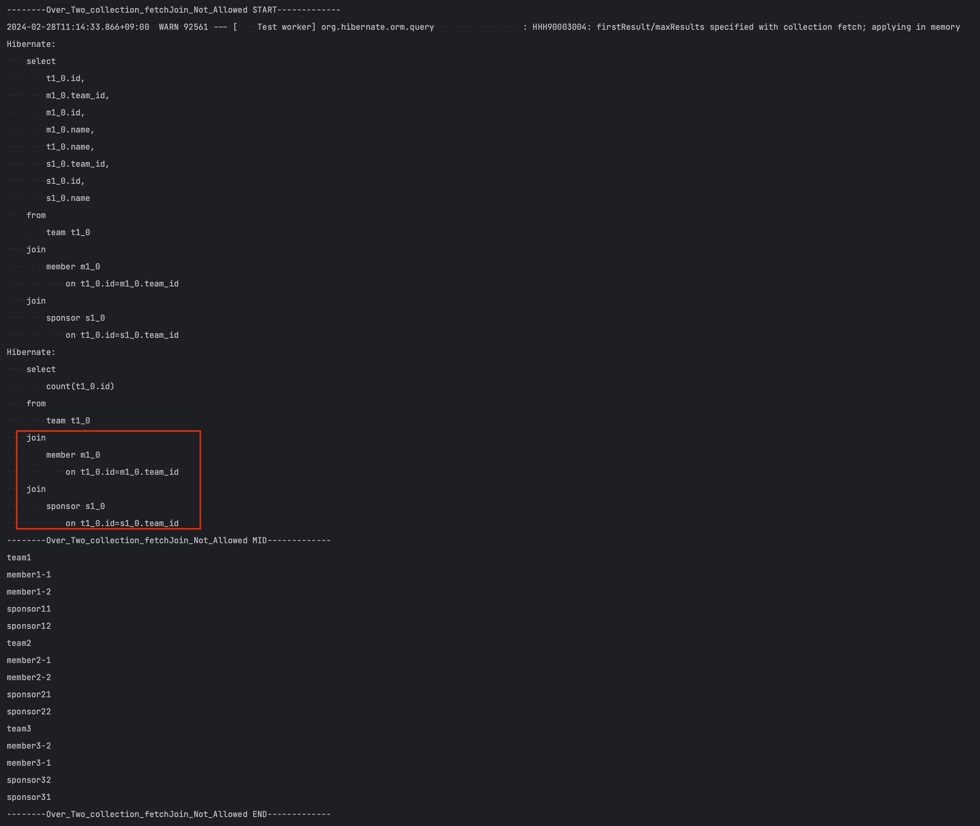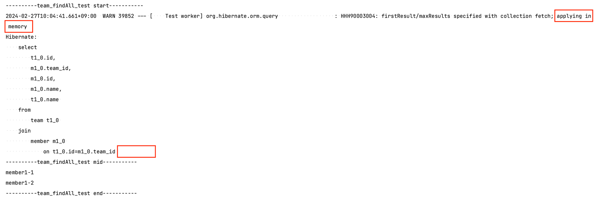 로그를 살펴보면 LIMIT 쿼리가 발생하지 않고, firstResult/maxResults specified with collection fetch; applying in memory 라는 경고가 발생했습니다.
