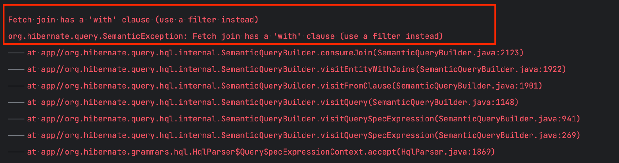 @DisplayName("join fetch는 on절 사용시 org.hibernate.query.SemanticException: Fetch join has a 'with' clause (use a filter instead) 발생")