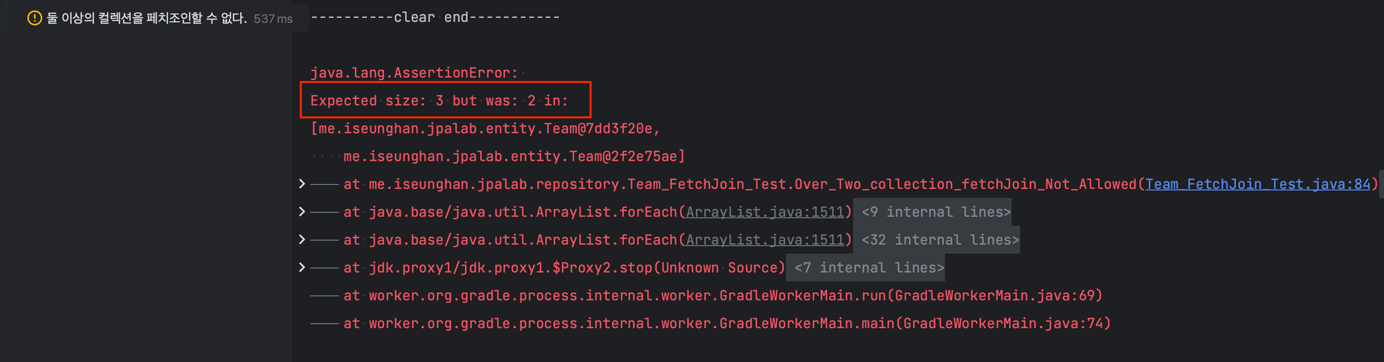 @DisplayName("둘 이상의 컬렉션을 페치조인할 수 없다.")