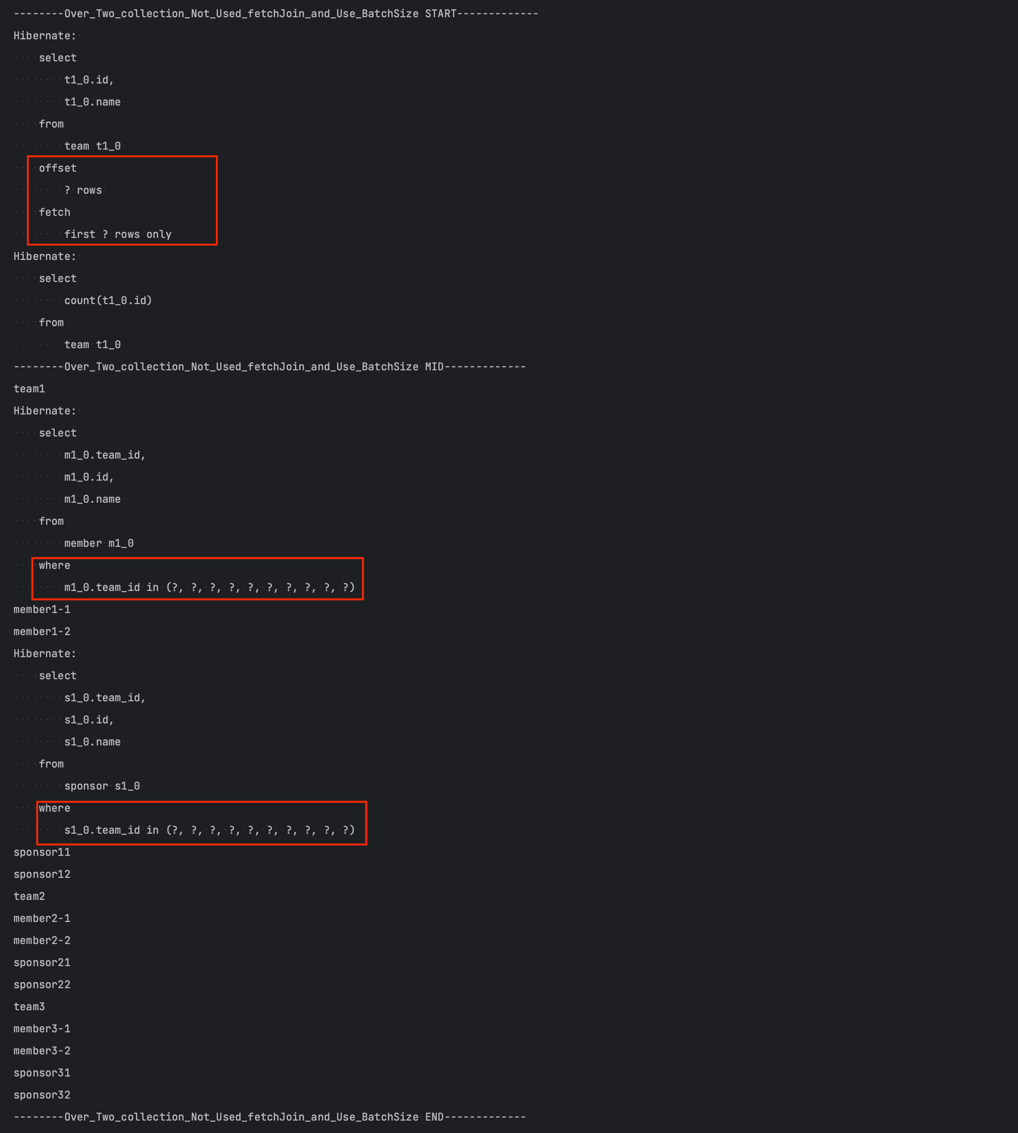 System.out.println("--------Over_Two_collection_Not_Used_fetchJoin_and_Use_BatchSize START-------------");