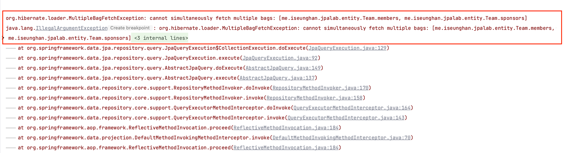 2. MultipleBagFetchException - 하나의 엔티티에서 2개 이상의 컬렉션을 조회할 때 (~ToMany 관계)